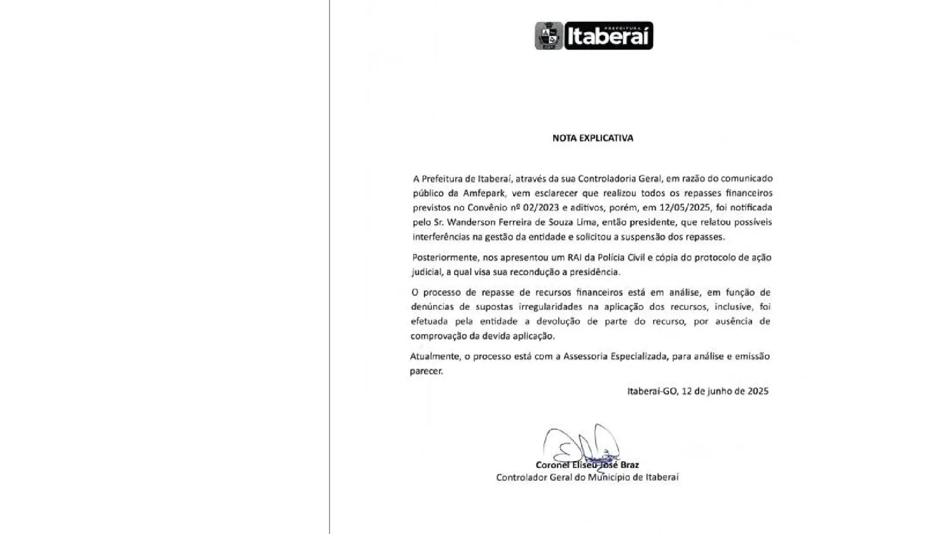 Controladoria-Geral de Itaberaí suspende repasse de recursos à Amfepark