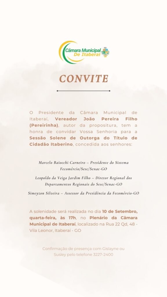 📍 Local: Câmara Municipal de Itaberaí (Rua 22, Quadra 48, Lote 11, Vila Leonor – Itaberaí/GO)